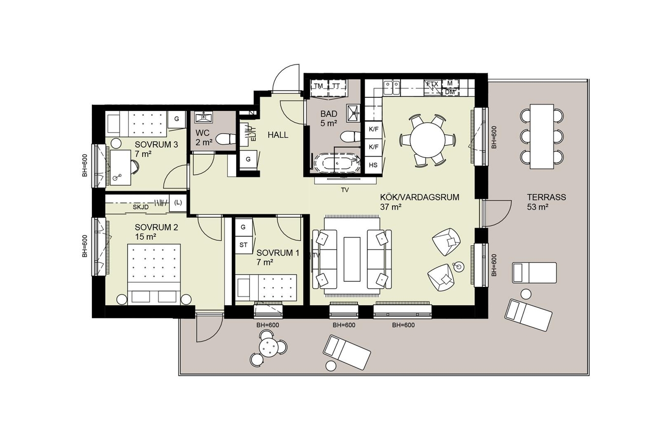 Här finner ni en 4:a med ett fint gavelläge och ett vardagsrum och kök i vinkel med öppen planlösning. Via vardagsrummet nås den stora terrassen som sträcker sig längsmed två av bostadens tre sidor – en riktig lyxig utemiljö!