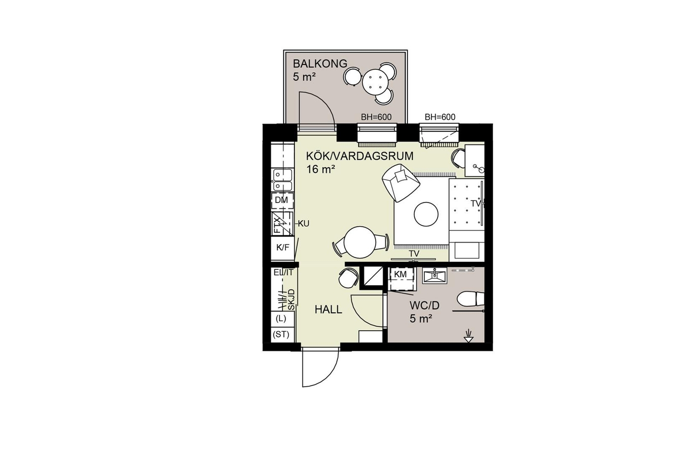 En effektiv 1:a med ljusinsläpp från flertalet fönster och balkong i nordvästläge. Kök och vardagsrum i öppen planlösning gör denna bostad mycket lättmöblerad.