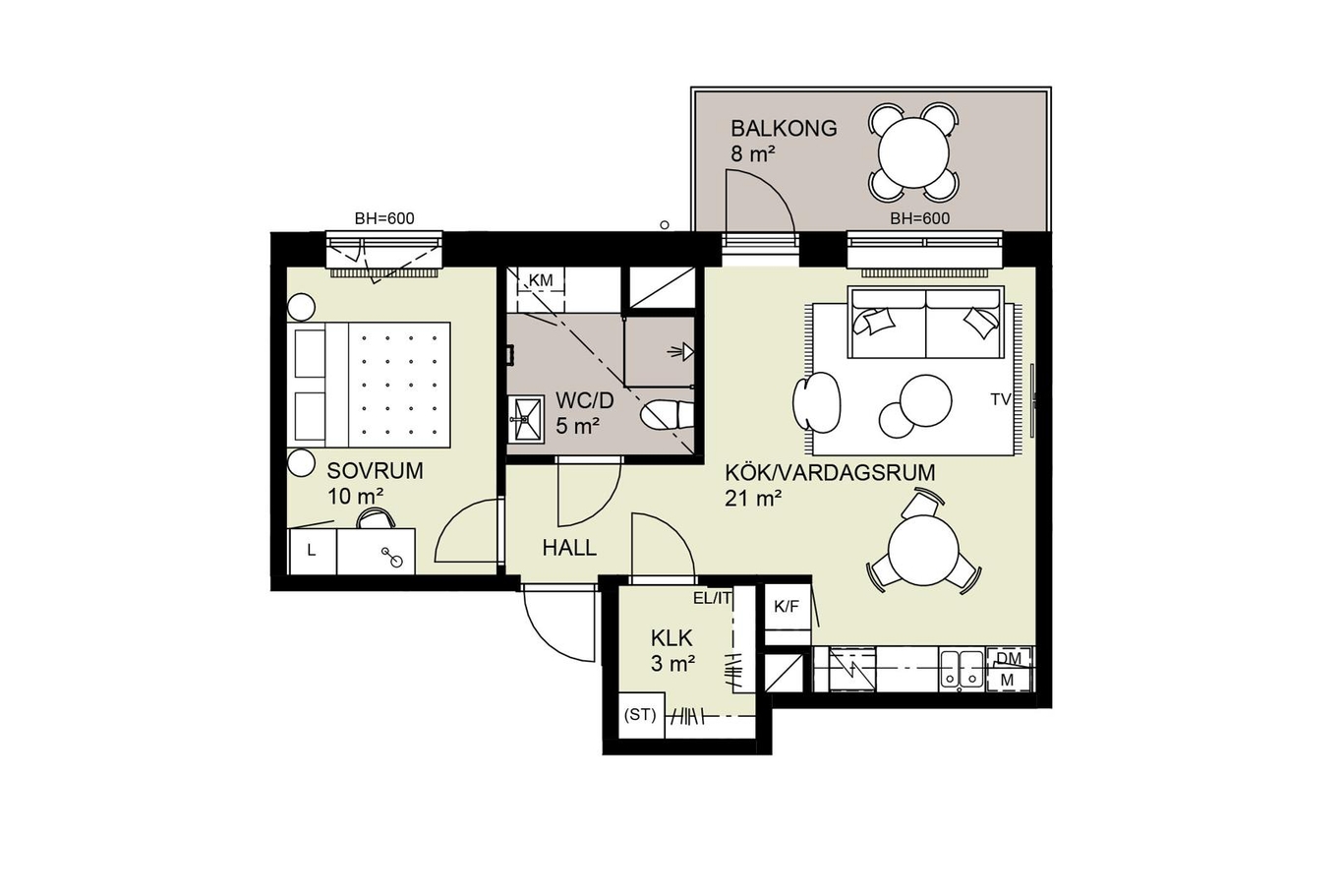Yteffektiv lägenhet om 45 kvm. I sovrummet ryms en dubbelsäng och klädkammaren ger bra förvaringsmöjlighet. Öppen planlösning mellan kök och vardagsrum som ger utgång till balkong mot innergården.