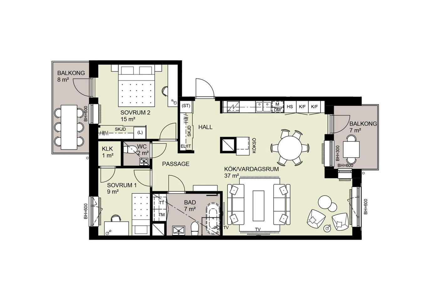 Fin trerummare med öppen planlösning mellan vardagsrum och kök. Dubbla balkonger och dubbla toaletter. Båda sovrummen vända mot innergården.