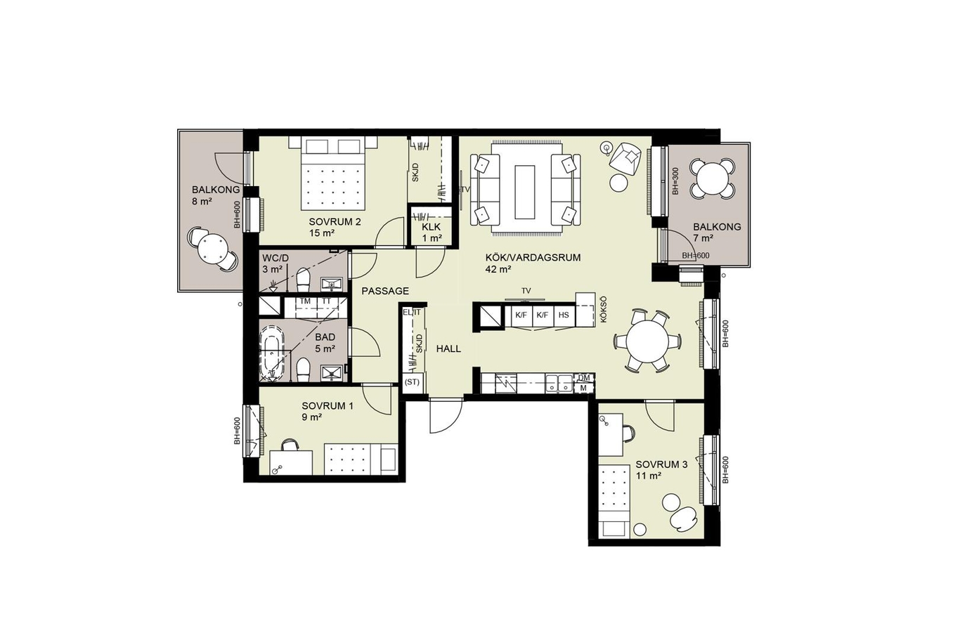 Trivsam lägenhet om 106 kvm med dubbla badrum och dubbla balkonger. Generösa rum och goda förvaringsmöjligheter. Möjlighet att nyttja det ena sovrummet som matrum.