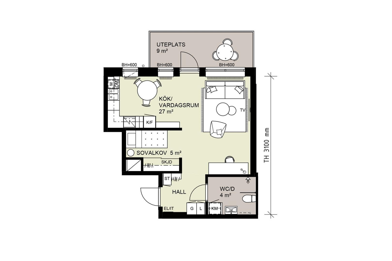 Välplanerad och rymlig etta med separat sovalkov och förvaring i skjutdörrsgarderob. Kök i vinkel med delvis öppen planlösning till vardagsrummet. Uteplats i västerläge och riktad mot föreningens gård.