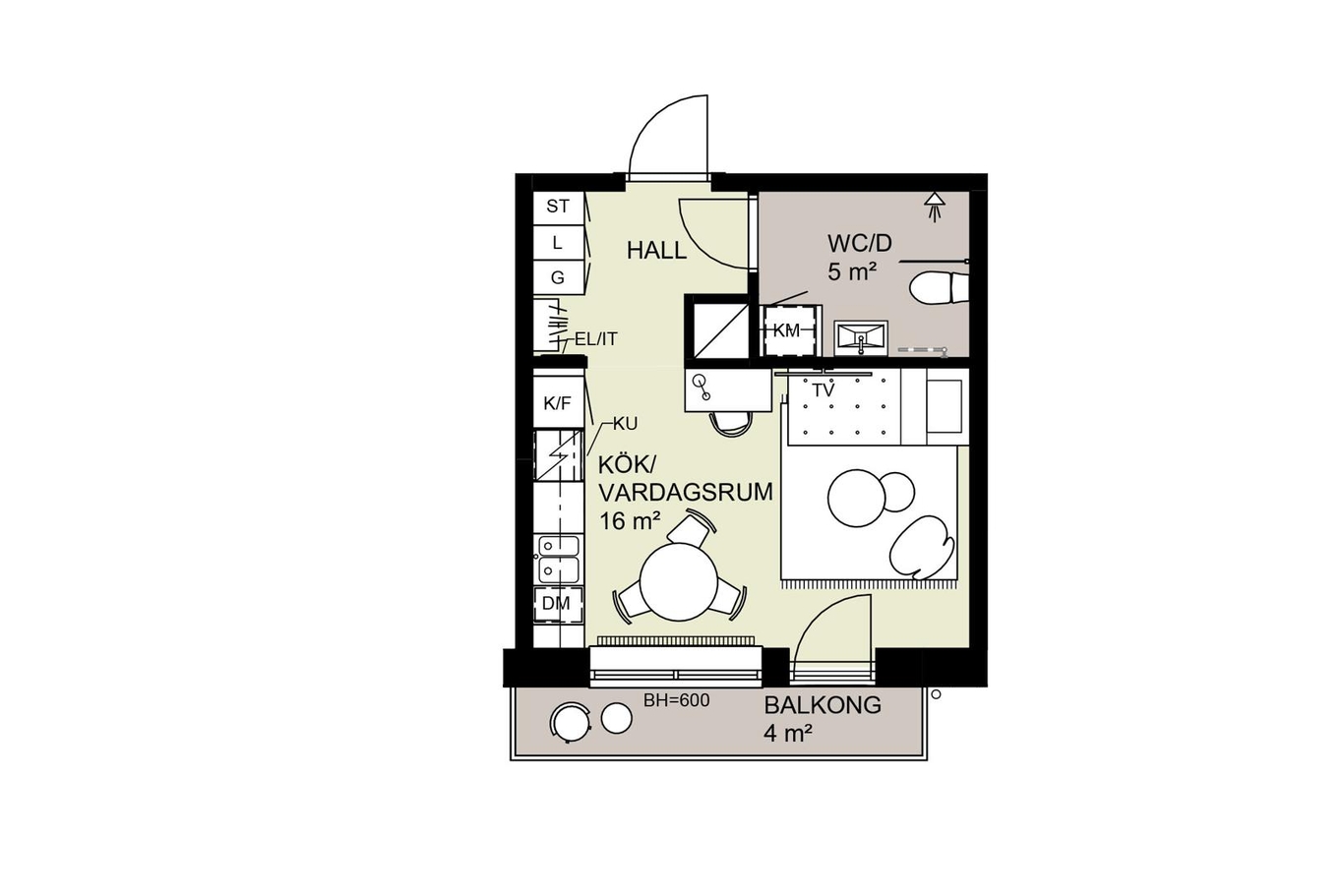 Kvadratsmart etta om 26 kvm med modern öppen planlösning. Plats för säng, soffa och matbord. Balkong i söderläge samt helkaklat badrum med dusch och tvättmaskin